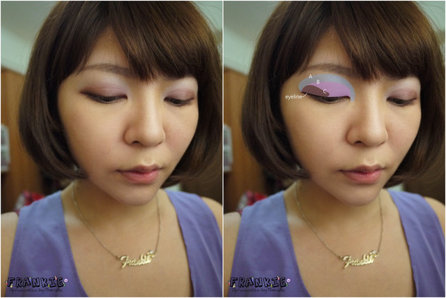 1.先用淡藍色A上整個眼皮,一直延伸到眼頭位置全部填滿2.用紫色B上眼摺部分,超過眼褶一點沒關係,張眼能看到的範圍