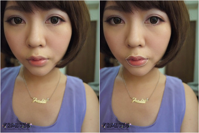 外圍先用白色遮去原本的唇色,在用紅色點在唇中,達到漸層的感覺整體完妝照如下