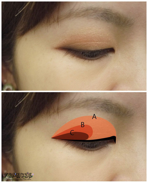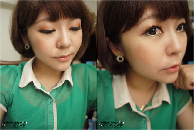 model琪琪就是用大片的橘色暈染整個上眼窩下眼影的部分在運用綠色眼影掃上