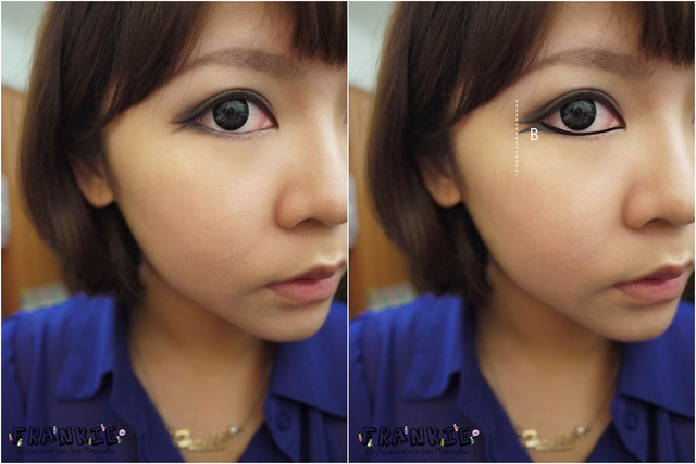 1.用B畫出一條與上眼線反其道而行的下眼線,位置大概是眼尾3/1處,延伸長度要記得跟上眼線平行(可以用刷頭較小的斜角刷,比較容易描繪精確)
