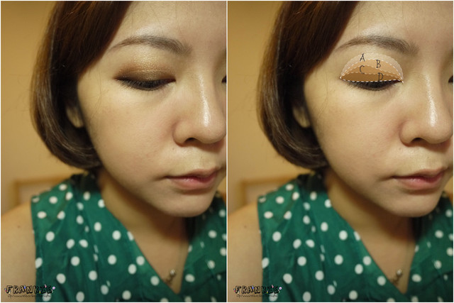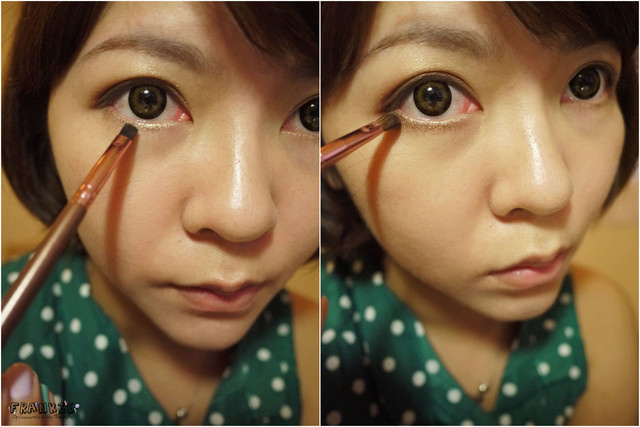 1.我先用A香檳金色用扁刷子在下眼線地方整個打量,可以有放大眼睛的效果2.用深棕色C刷上整個下眼線,眼尾略寬,越往眼頭力道越輕