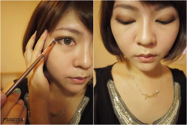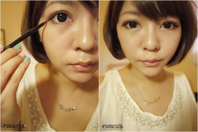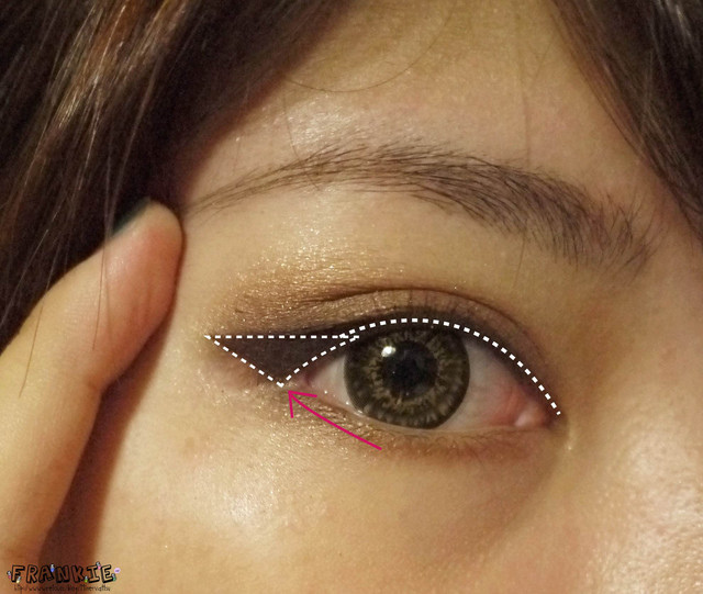 2.用深咖啡D描繪下眼下3/1處,同樣也是眼尾較粗,連接上眼線,往上帶勾出上揚的感覺