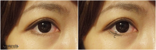 1.用深棕色C描繪下眼下3/2處眼尾較粗,越往眼頭越細