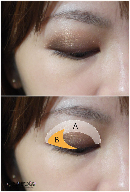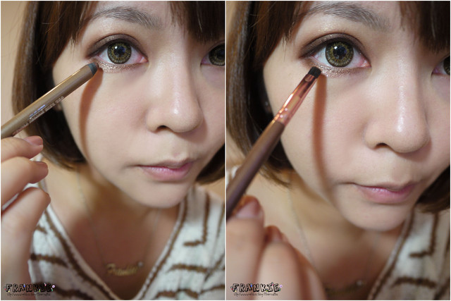 1.用solone眼線膠筆的古銅棕色填滿整個臥蠶處,眼尾較粗2.用眼影A暈開使線條柔和