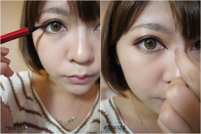 再來使用黑色眼線填滿內眼線,將眼頭處拉開畫出去一點,就會有開眼頭的效果了