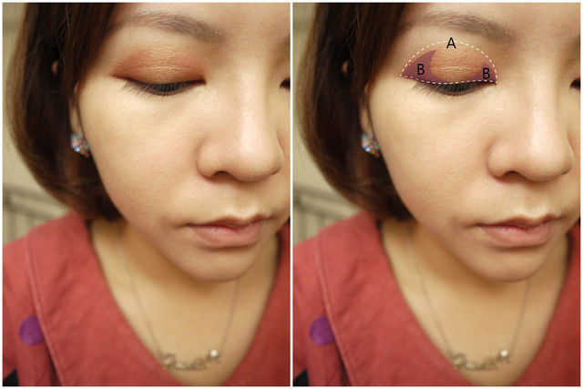 1.先用A打亮整個眼皮2.使用B加深眼尾三角,及眼頭三角處(範圍要高於眼摺)