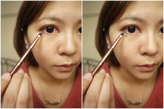 使用較扁的刷子,刷上C眼尾較粗,越往眼中越細可重複多刷幾次讓顏色飽和