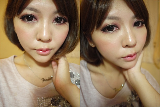 最後刷上睫毛膏,並在臉頰掃上淺粉色的腮紅,及擦上粉色口紅就完成了