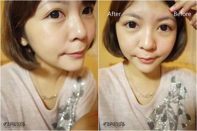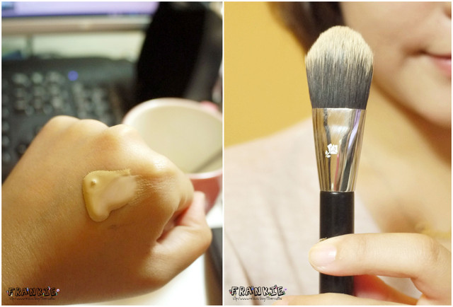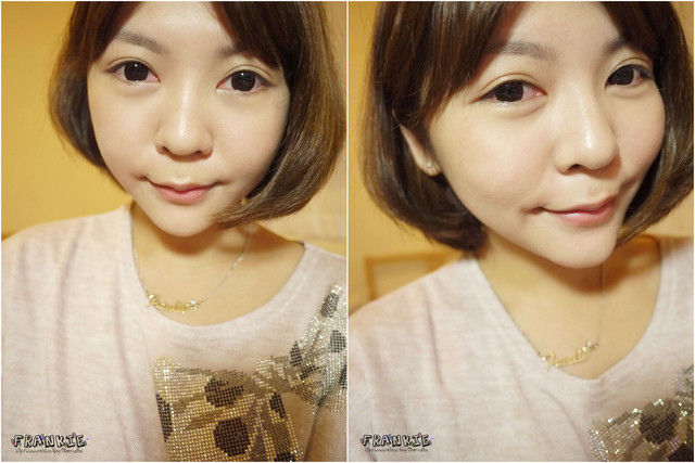 用粉底刷上完之後,會覺得妝感很輕透,比較左右兩邊可以看出左邊上完粉底後膚色明顯提亮,但又不會覺得厚重,有自然光澤