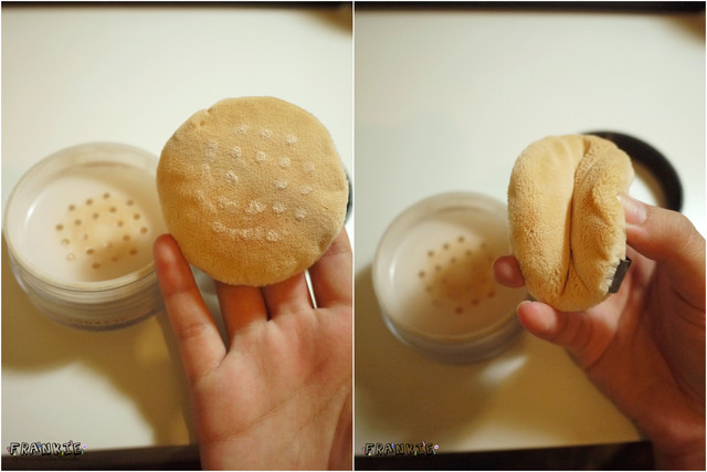 蜜粉附著在粉撲上後在對折搓揉使蜜粉均勻分佈在粉撲上使用部位也是較容易出油的T字部位和下巴