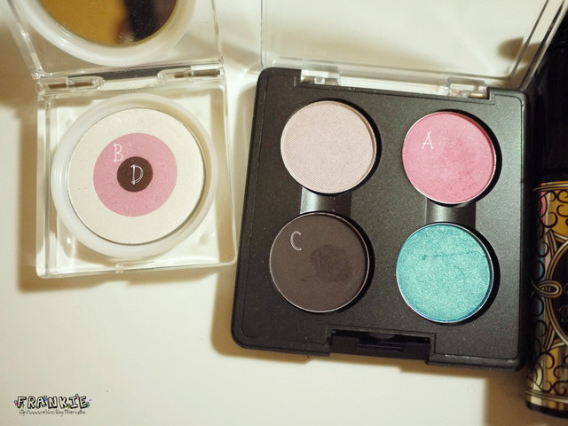 A為顏色飽和的桃紅色/B為較有光澤感的淡粉色/C為顏色較重的深咖啡色/D為偏紅色調較淺的咖啡色首先上眼影的部分