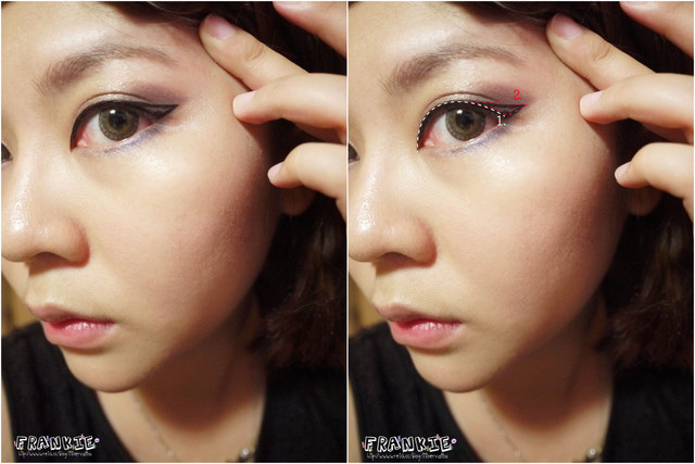 6.使用紫紅色B帶過眼中,模糊剛剛眼尾三角暈染的邊界線條