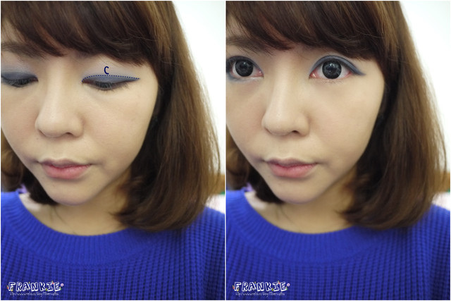 接著使用寶藍色C疊在眼褶範圍內 並稍微往眼尾延伸 拉長眼睛長度再來下眼影步驟
