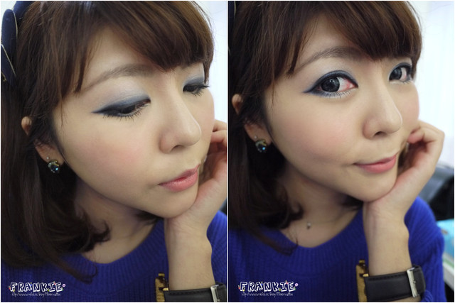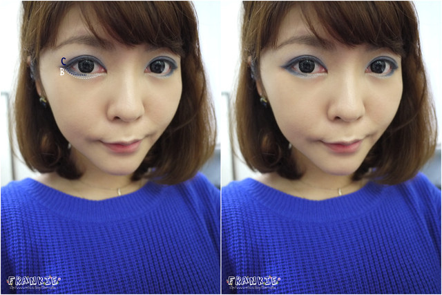 先用淺藍色B掃上整個臥蠶處之後在用寶藍色B疊在眼尾後3/2處最後再用銀白色A打亮眼頭